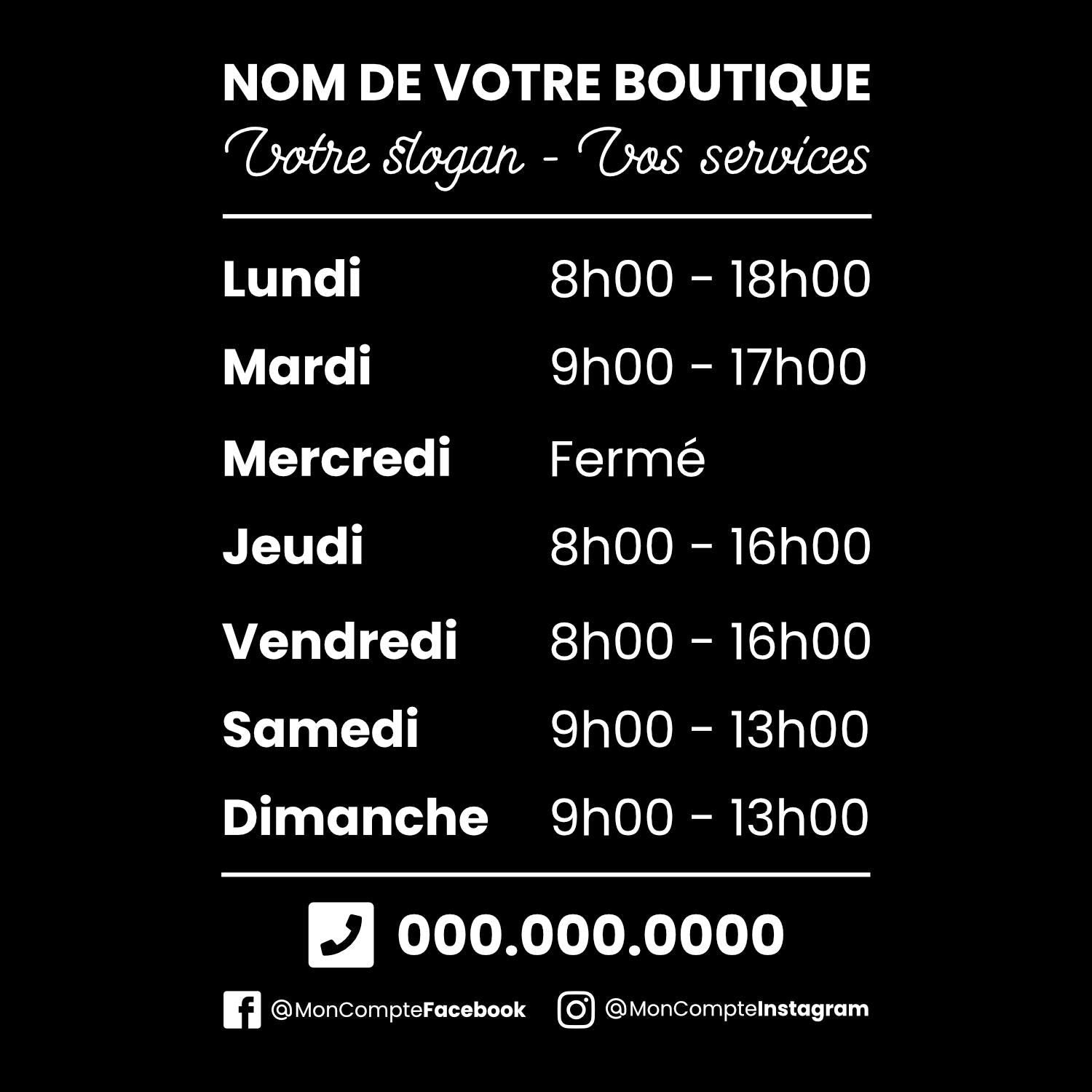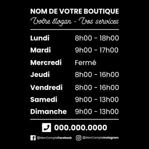 Sticker horaires d’ouverture vitrine | Autocollant vitrophanie heures d’ouverture magasin, salon de coiffure, restaurant, café et commerces