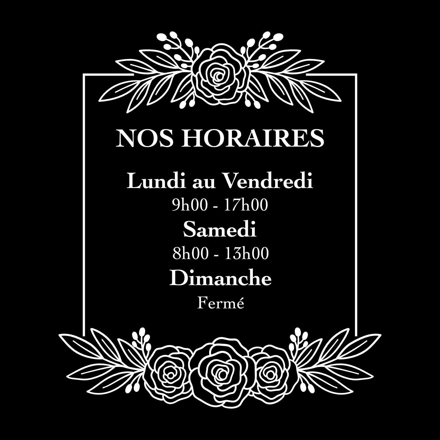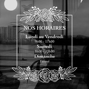 Sticker horaires d’ouverture vitrine | Autocollant vitrophanie heures d’ouverture magasin, salon de coiffure, restaurant, café et commerces
