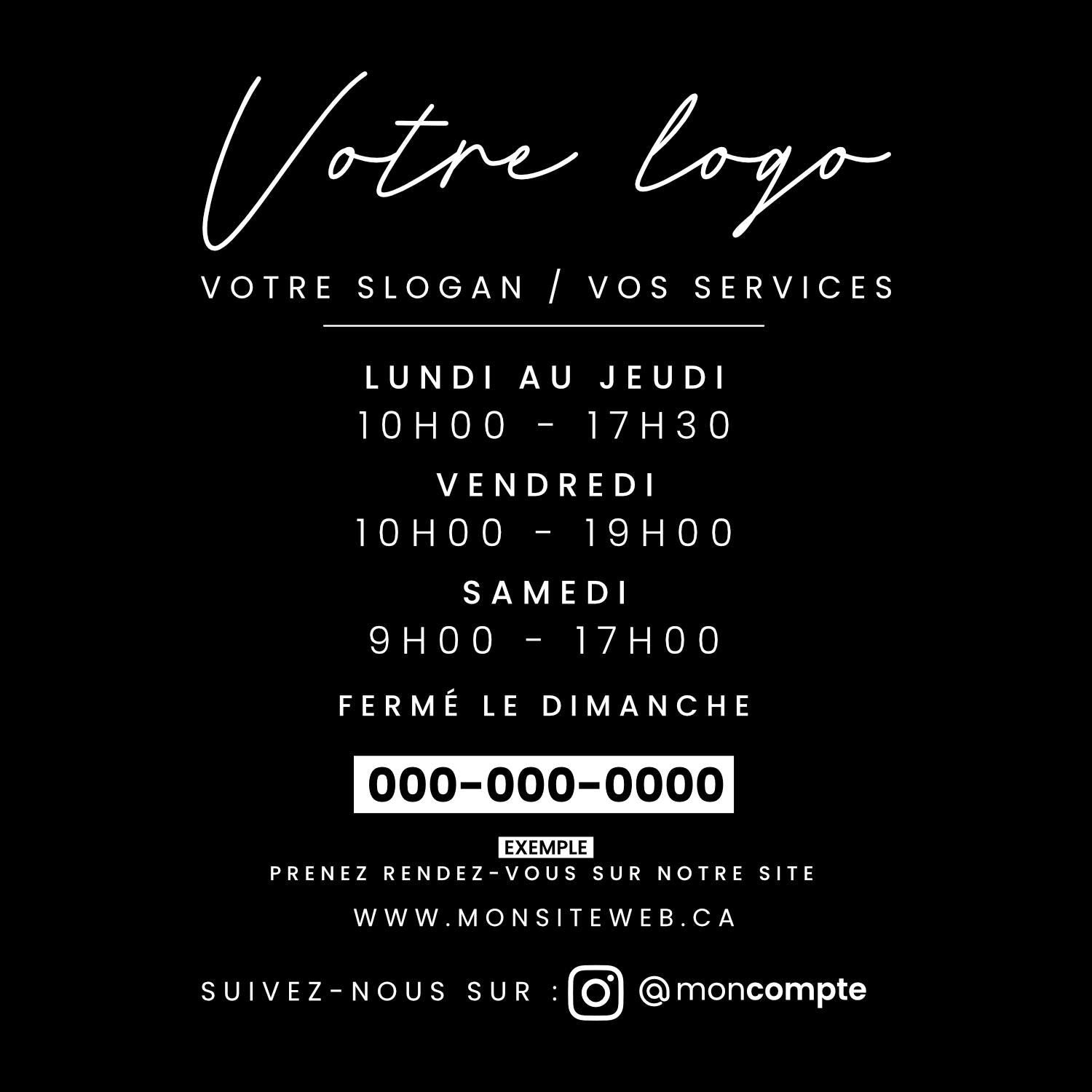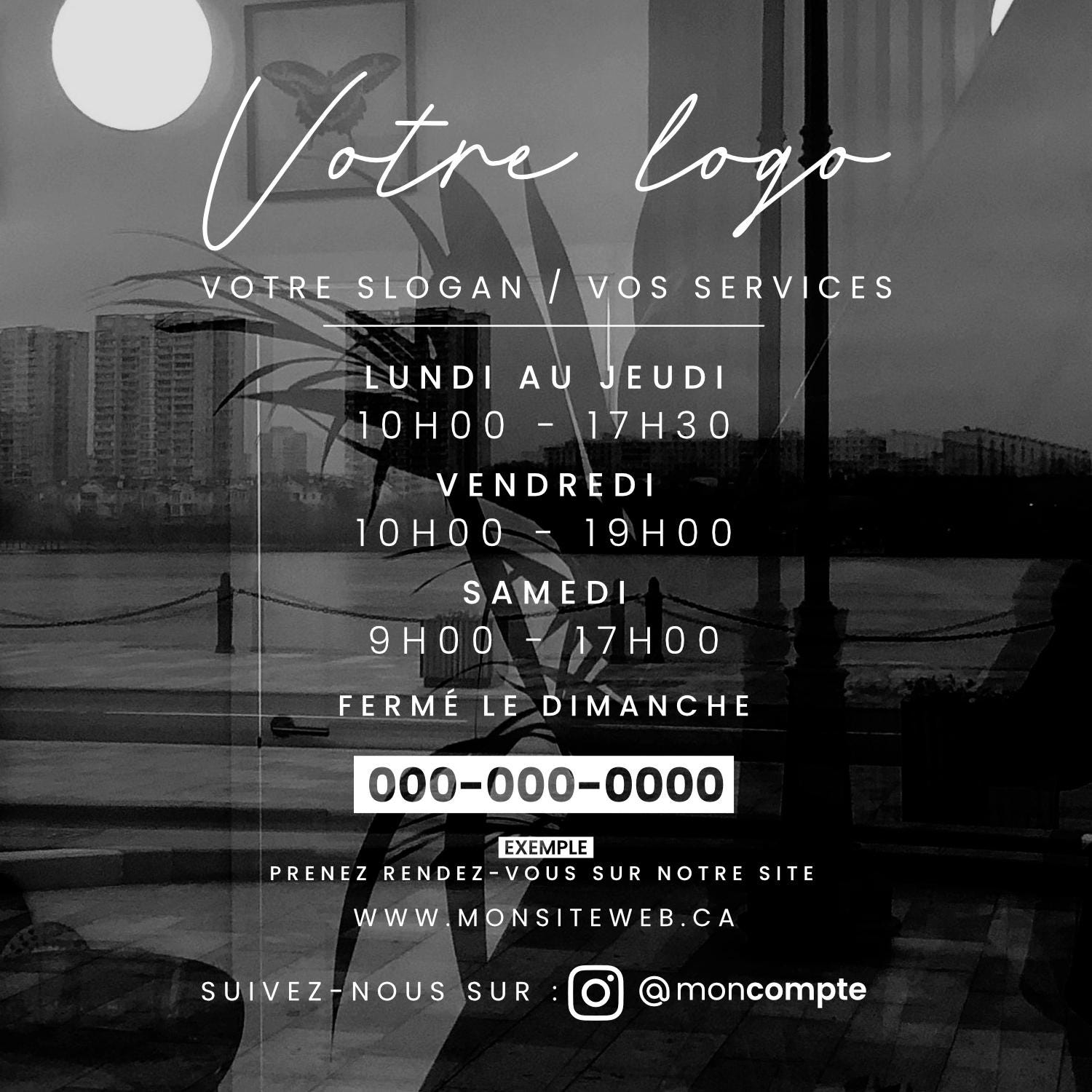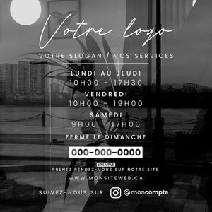 Sticker horaires d’ouverture vitrine | Autocollant vitrophanie heures d’ouverture magasin, salon de coiffure, restaurant, café et commerces