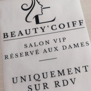 Un lettrage adhésif sur mesure pour votre magasin, boutique, coiffeur, restaurant et autres commerces.