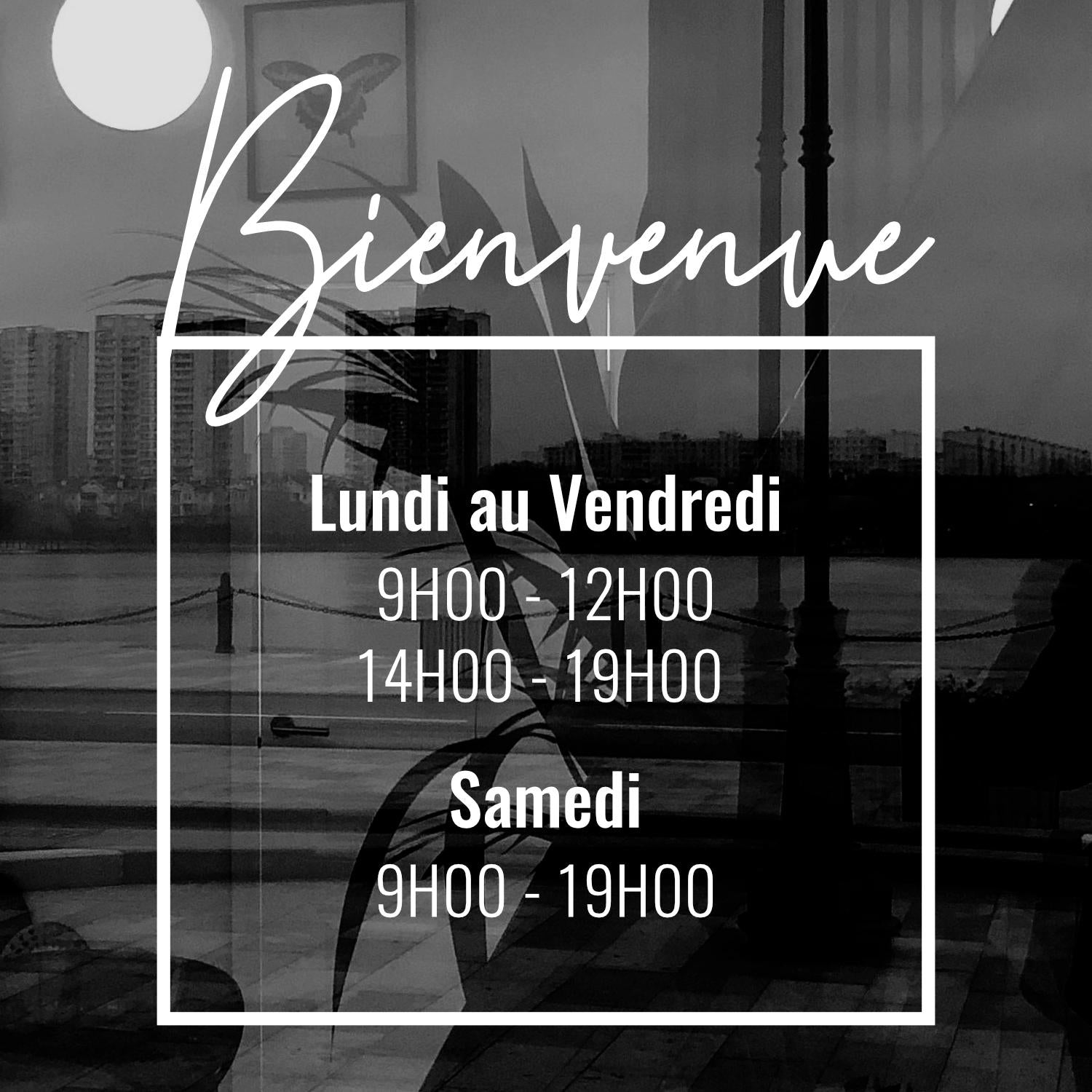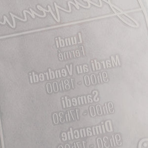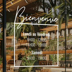 Sticker horaires d’ouverture vitrine | Autocollant vitrophanie heures d’ouverture magasin, salon de coiffure, restaurant, café et commerces